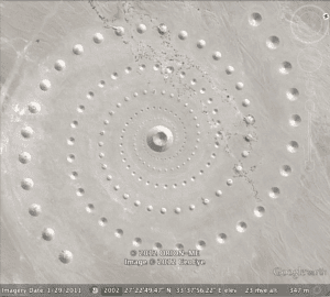 Desert Breath expands in an area of 100.000 m2, in the eastern Sahara desert bordering the Red Sea in El Gouna, Egypt. It is a site-specific work that generated out of our perception of the site itself. Its construction consists of the displacement of 8.000 m3 of sand formed so as to create precise positive and negative conical volumes. The conical volumes form two interlocking spirals that move out from a common centre with a phase difference of 180o degrees in the same direction of rotation. The centre is a 30-metre diameter vessel formed in a W-shaped section and filled with water to its rim. Located between the sea and a body of mountains at the point where the immensity of the sea meets the immensity of the desert, the work functions on two different levels in terms of viewpoint: from above as a visual image, and from the ground, walking the spiral pathway, a physical experience. The construction of Desert Breath was completed in March 1997. Desert Breath still exists becoming through its slow disintegration, an instrument to measure the passage of time.